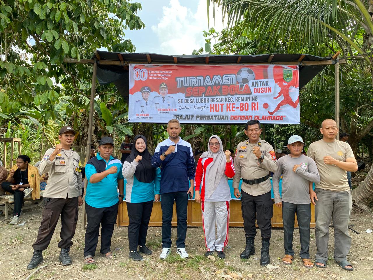 Lubuk Besar, 13 Agustus 2025 — Suasana Lapangan Sepakbola Desa Lubuk Besar pada Selasa siang terasa begitu semarak. Pemerintah Desa Lubuk Besar menggelar acara Pembukaan Turnamen Sepakbola Antar Kepala Dusun sekaligus membuka berbagai pertandingan dan lomba dalam rangka menyambut Hari Ulang Tahun Kemerdekaan Republik Indonesia ke-80.